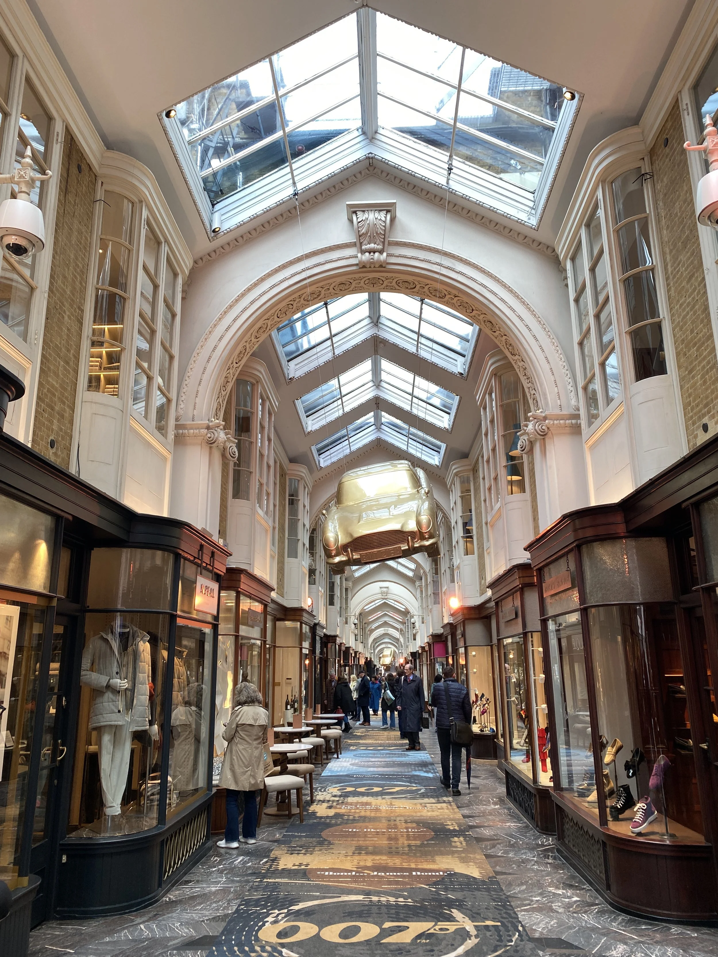 Lissy and I visited the arcade twice, noticing a stark contrast between days. Sunday felt dim and lifeless with closed shops and no music, while Monday was brighter and more vibrant. The arcade’s luxurious, bold style featured gold and wood elements, with most shops catering to high-end professionals, offering items like leather shoes, ties, and briefcases.